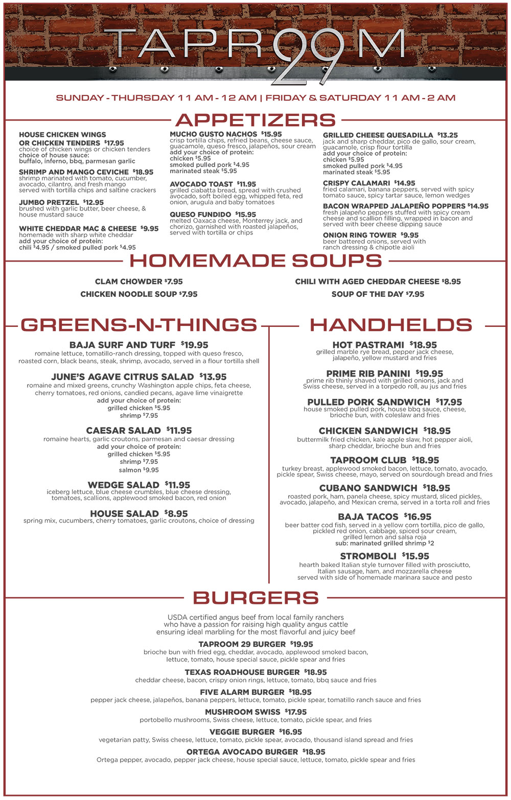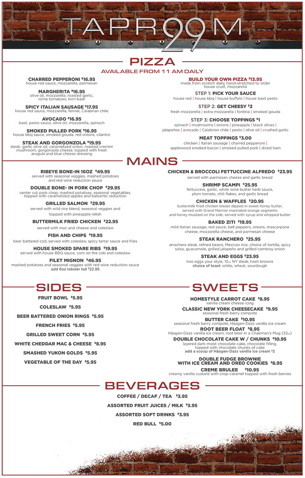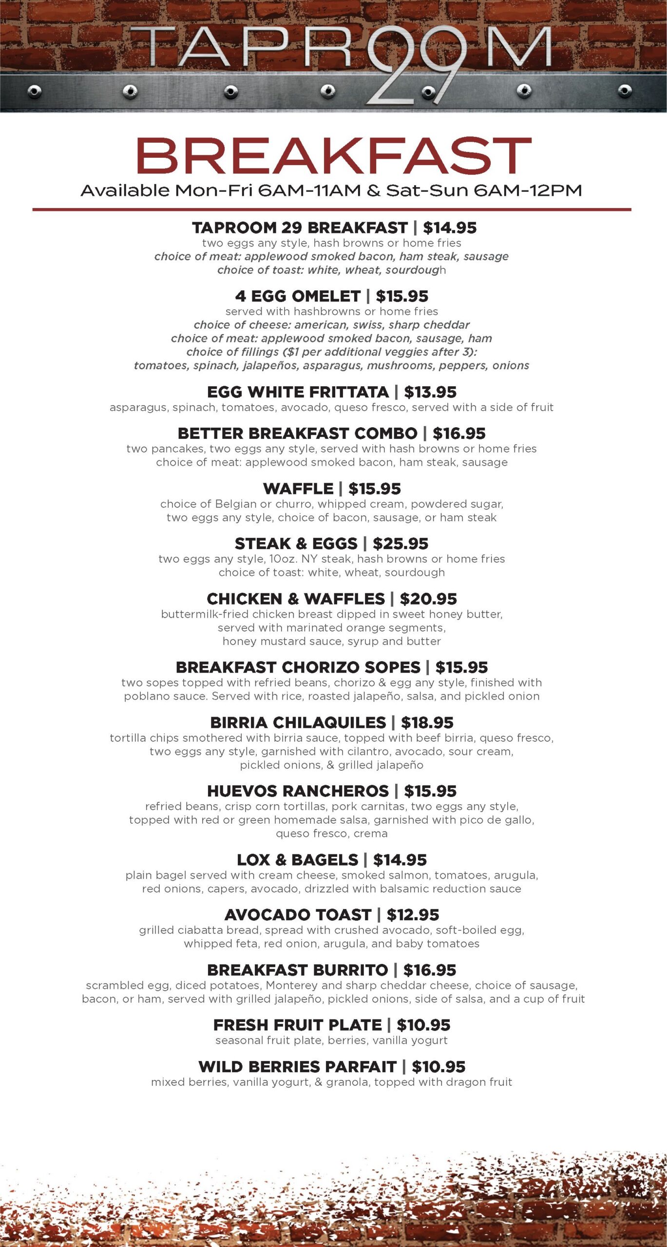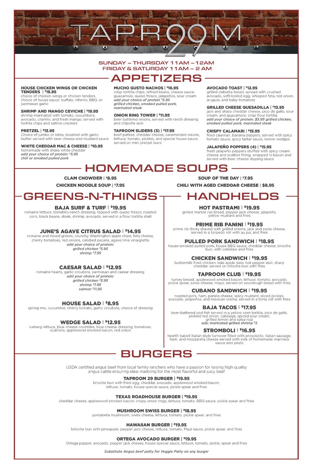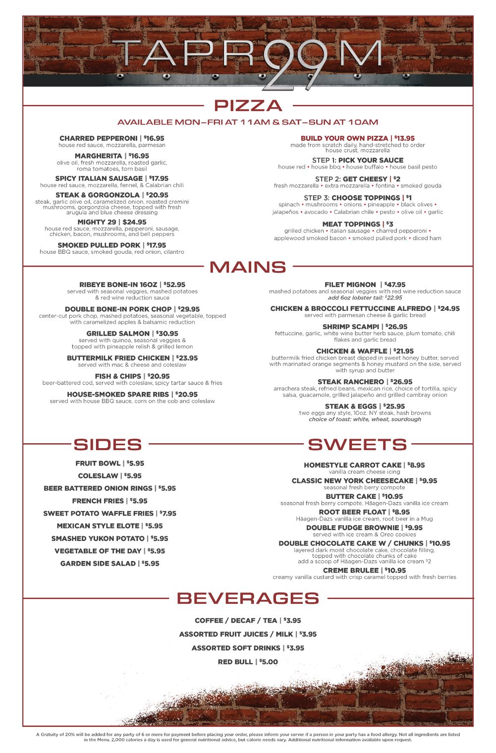 Love craft beer, pub food, and catching the big game? Taproom 29 is the ultimate spot to kick back and enjoy. Grab a seat at the bar and take advantage of our wraparound cold plate, designed to keep your beer at the perfect 29-degree temperature. With a game-changing selection of 29 beers on draft, and an extensive menu featuring innovative pub fare, artisanal brick-oven pizzas, and house-made specialties, there’s something for everyone. And with 35 TVs, you can watch your favorite team from any angle, making every game day a great day at Taproom 29.